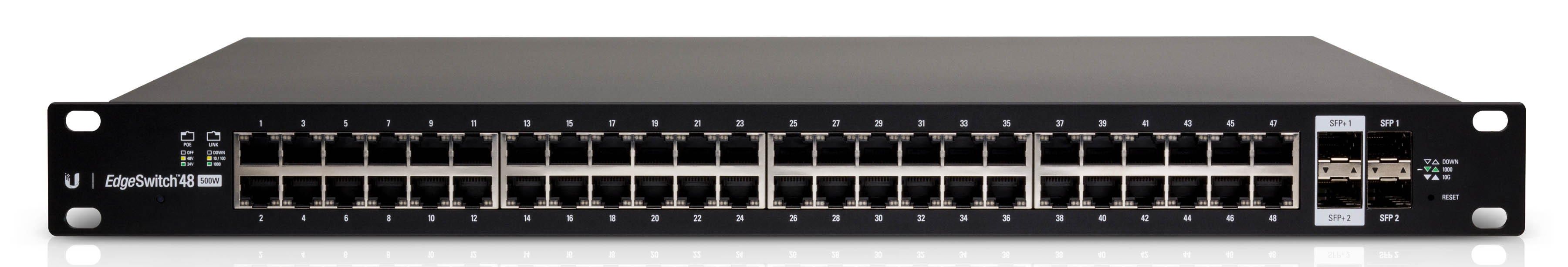 UBNT EdgeMAX ailesinin geniş çaplı kurumsal ağ ihtiyaçlarını karşılamak için tasarlanmış UBNT EdgeSwitch ES-48-500 modeli, Layer -2 ve Layer -3 standartlarını destekleyen gerçek yönetilebilir switch özelliklerinin yanısıra 802,3 af/at ve 24V Pasif PoE standartlarında 48 adet Gigabit ethernet portu, 2 adet SFP+ ve 2 adet SFP portu ile gelmektedir. EdgeSwitch ES-48-500 tüm portlardan herhangi bir paket kaybı olmaksızın ve eş zamanlı olarak 70Gbps gerçek bant genişliği sağlamaktadır. EdgeSwitch üzerine 802,3af standartlarını destekleyen ürün bağlarsanız EdgeSwitch bu cihazı otomatik olarak algılar ve bağladığınız cihazlara doğrudan voltaj verir, eğer Bağladığınız ürün 24 Pasif PoE standartlarını destekliyorsa, EdgeSwitch'in yönetim arayüzünden bağlantı yaptığınız portun 24V PoE desteğini etkinleştirmeniz gerekmektedir.